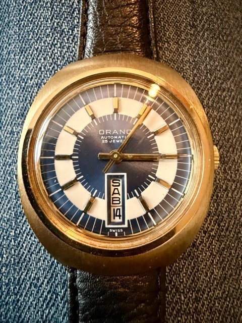 Montre Orano NOS Swiss Automatique day date bleue vintage