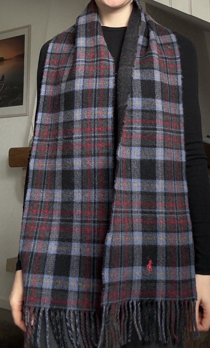 Authentic Polo Ralph Lauren scarf in a classic plaid (tartan) pattern, made in Italy from soft and warm wool.Timeless design with the iconic embroidered Polo logo – a perfect everyday luxury accessory.✨ Details: • Brand: Polo Ralph Lauren • Color: Grey / blue / red plaid • Material: Wool • Size: approx. 160 × 23 cm • Made in Italy • Fringe edges • Embroidered Polo logo✔️ Condition: Very good, gently used. No holes or stains.Slight natural signs of wear on the fabric (see photos), still looks great.