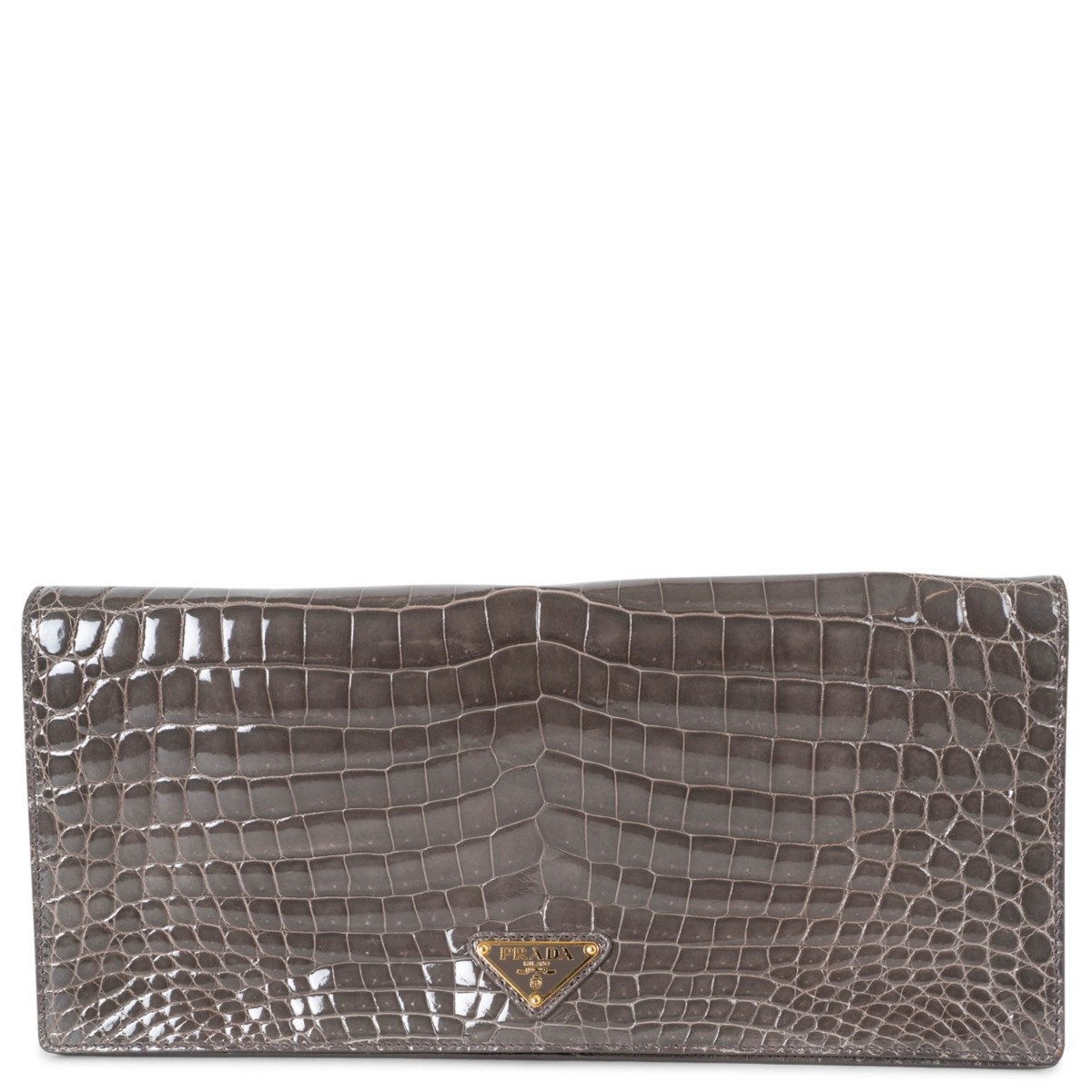 Diese authentische Prada Clutch vereint zeitlose Eleganz mit anspruchsvollem Design. Gefertigt aus glänzendem Krokodilleder in anthrazitgrau, besticht sie durch ihre längliche Silhouette, die die natürliche Textur und den Glanz des exotischen Leders hervorhebt.