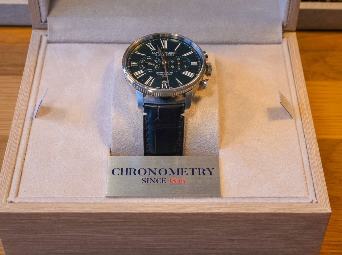 This limited edition Ulysse Nardin Marine Torpilleur Annual Chronograph is a rare find, with only 300 pieces produced worldwide. Number 66, it comes as a complete set with original box, papers, and documents, purchased from Les Ambassadeurs in Lucerne in August 2021. The manufacturer's warranty is valid until August 2026, offering peace of mind.