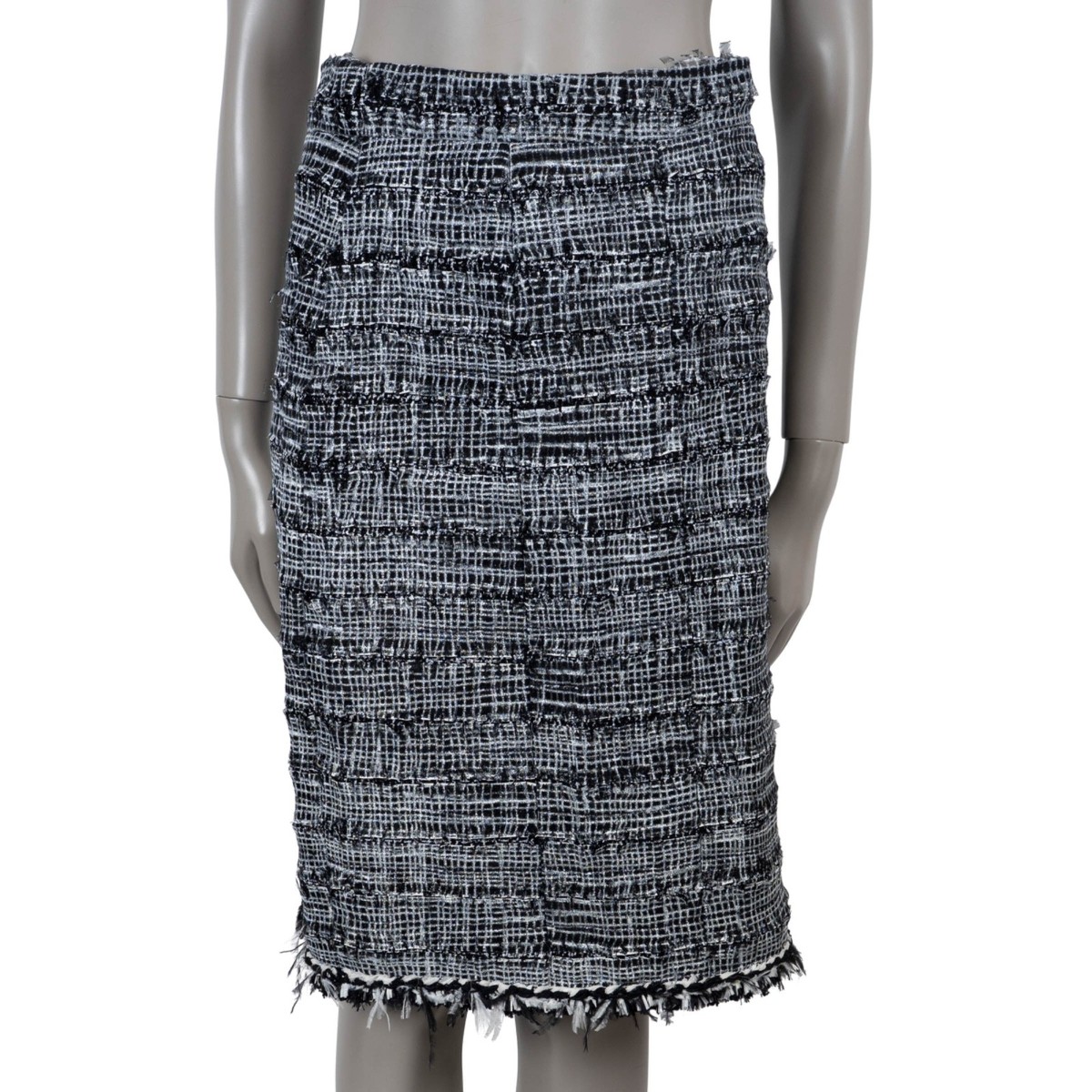authentic Chanel skirt in black and white tweed composed of viscose (45%), cotton (25%), nylon (23%) and wool (7%). Designed in a high-waisted, straight-cut silhouette with a mini length, this statement piece is elevated with braided and fringe trims accented by