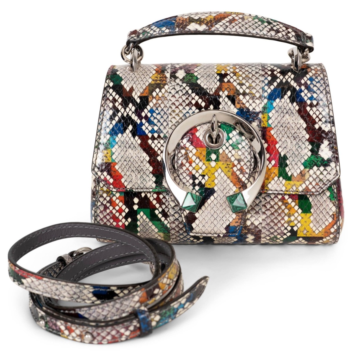 Welcome to LUX l Authentic Designer ConsignmentRämistrasse 25, 8001 Zürich, Switzerland I Tue-Fri 11-18:30 & Sat 11-16:00By bidding on our auctions you are agreeing to our Terms and Conditions below.All items come with authenticity guarantee!------------------------------------------------------------------------------------------------------------------------------------------ Product Description:100% authentic Jimmy Choo Madeline bag in taupe and rainbow shiny Elaphe snakeskin, exquisitely crafted in a structured, feminine silhouette that highlights the vibrant, iridescent scale pattern of the exotic leather. This statement piece features polished silver-tone hardware, a refined top handle, and a detachable, adjustable shoulder strap for versatile styling, while the front is finished with subtle logo embossing and the signature circular buckle adorned with striking malachite stones. The flap secures with a concealed magnetic snap, opening to a grey suede-lined interior fitted with a zipper pocket against the back, embodying Jimmy Choo’s distinctive blend of glamour and modern sophistication. Has been carried and is in excellent condition. MeasurementsHeight15cm (5.9in)Width20cm (7.8in)Depth10cm (3.9in)Drop of the Handle7.5cm (2.9in)Shoulder Strap Length110cm (42.9in)HardwareSilver-ToneShopZurich - RämistrasseAll our listings include only the listed item unless otherwise specified in the description above - Price includes US tariffs - for all other countries price does not include import duties & taxes - check your countries import laws prior purchase------------------------------------------------------------------------------------------------------------------------------------------ Terms & Conditions Luxury-Shops is not affiliated with any of the name-brand items we offer for sale.Warranties and Liabilites: Luxury-Shops declines all responsibility and cannot be held liable for any damages caused by the use of a specific garment.We also cannot be held responsible for the quality of an item (we are not the manufacturer) or any damages resulting from a manufacturing defect.No warranties of any kind are given or implied.Condition of Merchandise: Luxury-Shops offers for sale luxury top-quality products. We fully disclose the condition of each item. In the description of each product, Luxury-Shops will specify the conditions if different from the standards set by the market (Required disclosure of prior use)The main characteristics of products are shown in great detail (through numerous photographs and in-depth descriptions). The products offered for sale MAY NOT correspond to the real garments in terms of image and color because of the Internet Browser or Monitor used (color calibration). Luxury-Shops disclaims all responsibility.Every used item offered by Luxury-Shops has been cleaned and restored to the best possible condition unless noted otherwise. Every used or vintage handbag has been polished and refinished. Your purchases will be sent to you ready to be used or worn.Please be aware that vintage items may be delicate and may not be as resilient as a brand-new item. Please take appropriate care when using a vintage item. Damage to items after receipt or use by customers is not the responsibility of Luxury-Shops.Luxury-Shops is a reseller of authentic designer and vintage merchandise. We are not an authorised dealer and are not affiliated with the brands we sell on our site. Store-new designer items are only available from an authorised dealer or the actual store. Once the item leaves the authorised dealer with a customer, the item is considered pre-owned. However, items can be pre-owned and in new condition - that is, never used by the owner. Below are the definitions of the descriptions we use.NEW: in new condition, that is, never used. This means the item may have been purchased by us from an authorized dealer o…