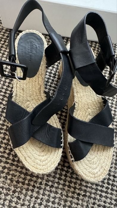 Please feel free to ask any questions. The price is negotiable and discounts are possible.Description (Français)Sandales noires originales de Celine. Avec un talon compensé, semelle tissée et cuir souple, ces chaussures sont en excellent état. Taille 37 avec une longueur de semelle intérieure de 24 cm, convient pour la taille 36,5 également.