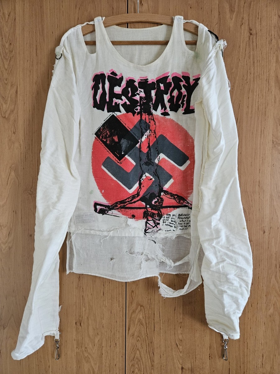 Questo top vintage a manica lunga degli anni 70 di Seditionaries mostra la collaborazione iconica tra Malcolm McLaren e Vivienne Westwood. Realizzato in mussola leggera, presenta un'estetica "destroy" consumata che cattura lo spirito ribelle della moda punk.