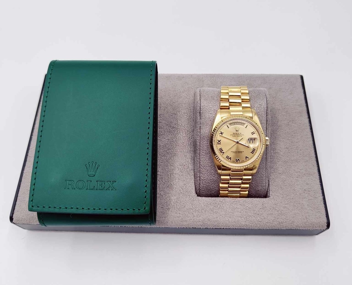 Questa classica Rolex Oyster Perpetual Day-Date unisce eleganza senza tempo e precisione svizzera. La cassa da 36mm e il bracciale abbinato sono realizzati in oro giallo 750, offrendo una sensazione lussuosa perfetta per occasioni speciali o come pezzo distintivo per l'uso quotidiano.
